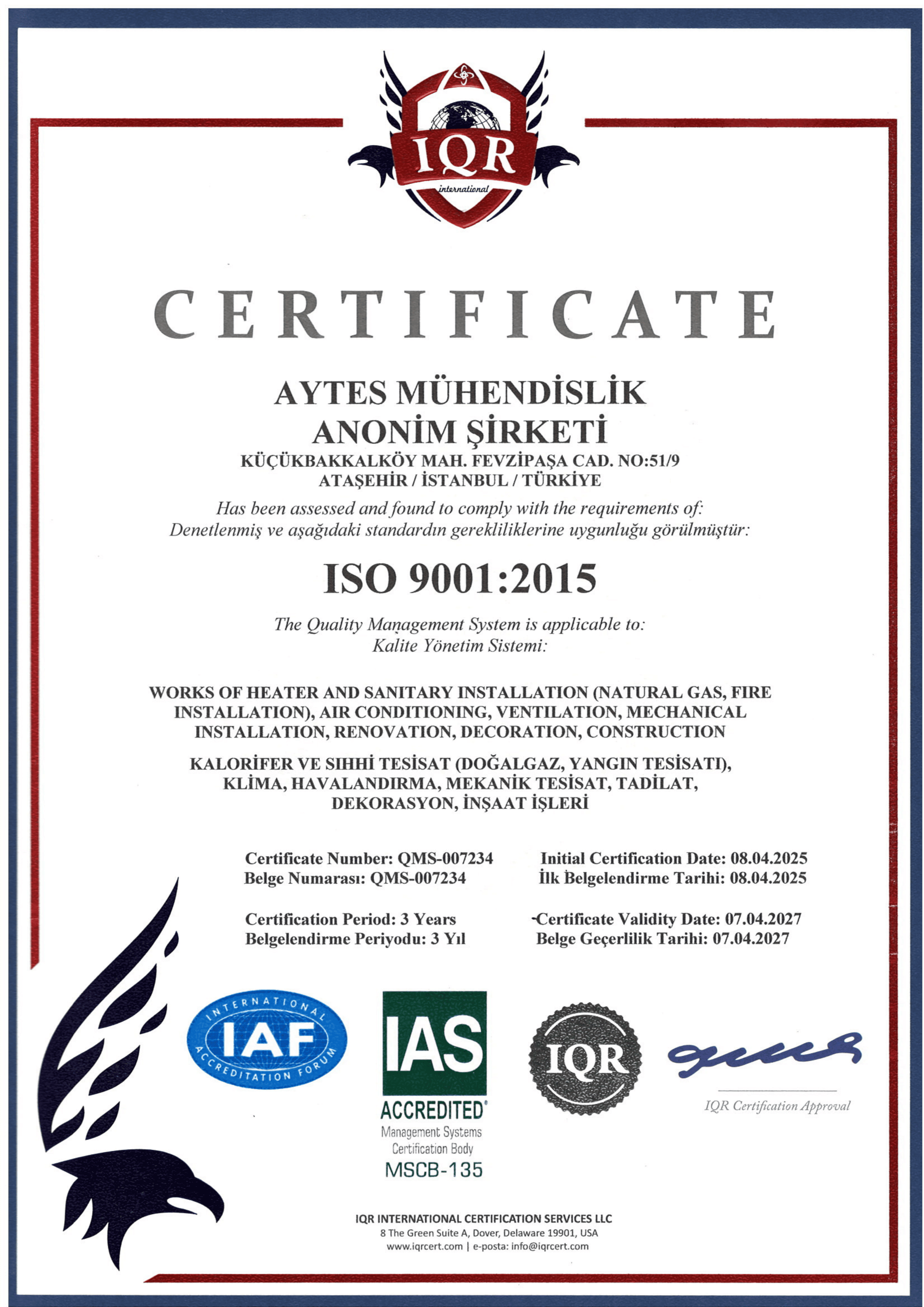 Aytes Mühendislik olarak, kalite ve güvenilirliği her zaman ön planda tutuyoruz. Sahip olduğumuz sertifikalar, hizmetlerimizin uluslararası standartlara uygun olduğunu ve en yüksek kalite normlarına göre çalıştığımızı göstermektedir. Her projede mükemmelliği hedeflerken, sertifikalarımızla da bunu belgeliyoruz. Güven, kalite ve sürdürülebilirlik alanındaki taahhütlerimizi, sahip olduğumuz yetkinlik belgeleriyle kanıtlıyoruz.
